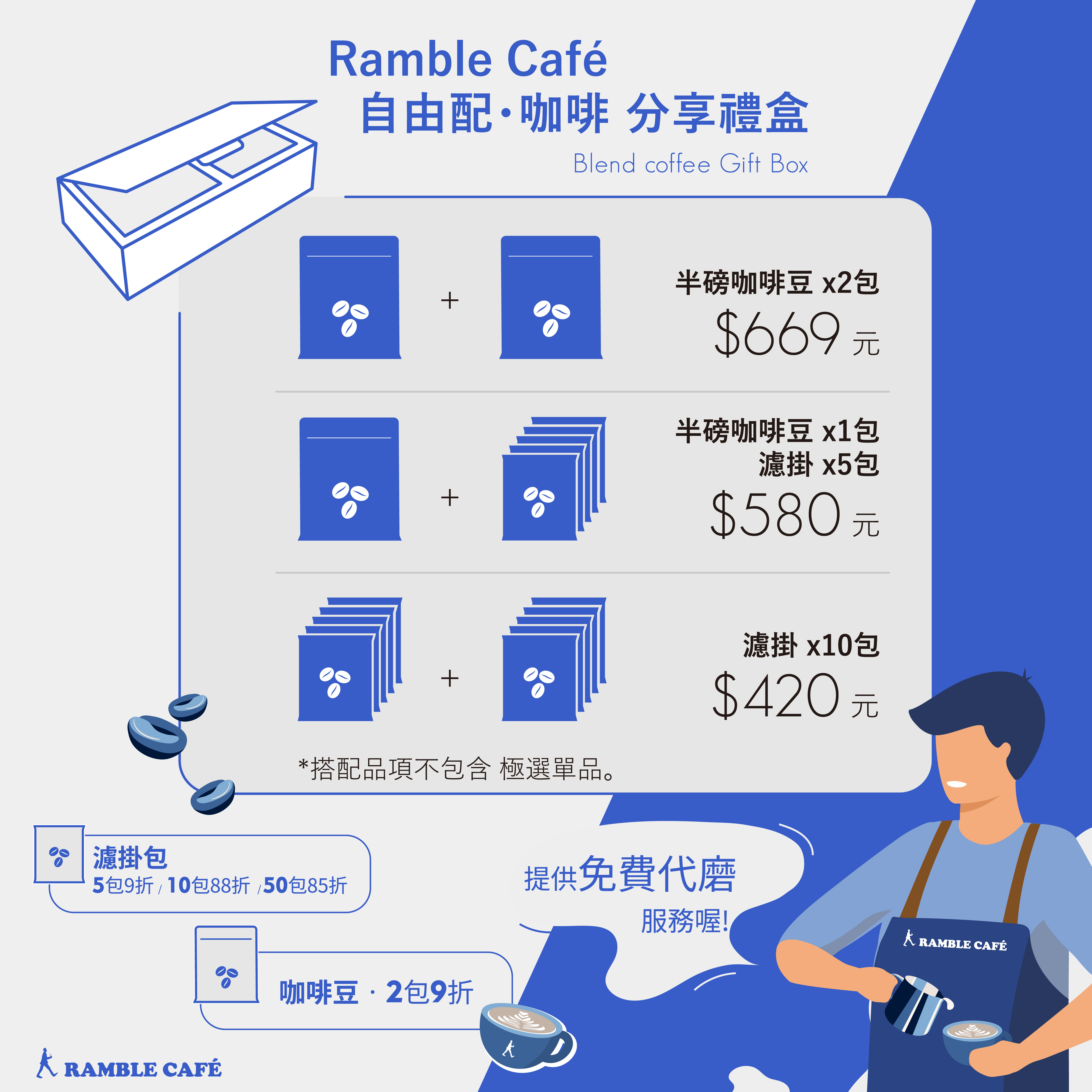 ① 半磅咖啡豆 (RAMBLE經典綜合豆x8)